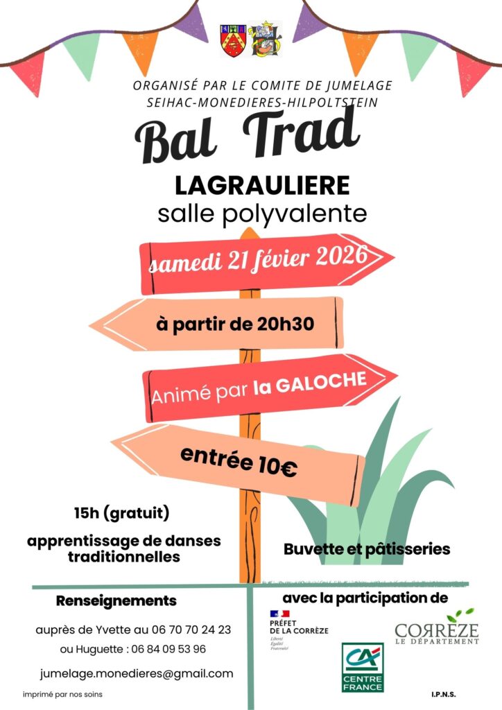 BAL TRAD organisé à Lagraulière par le comité de Jumelage Seilhac Hilpolstein Le 21 février 2026 de 15h00 à 18h00 Publié le mardi 17 février 2026